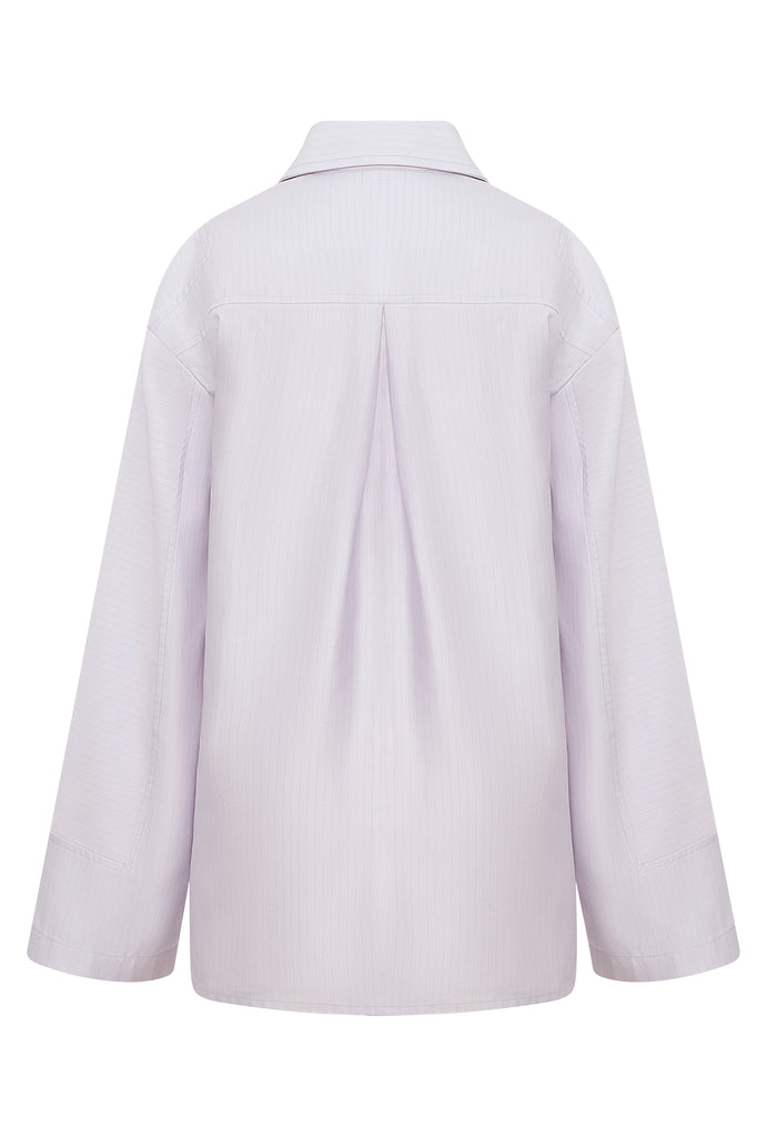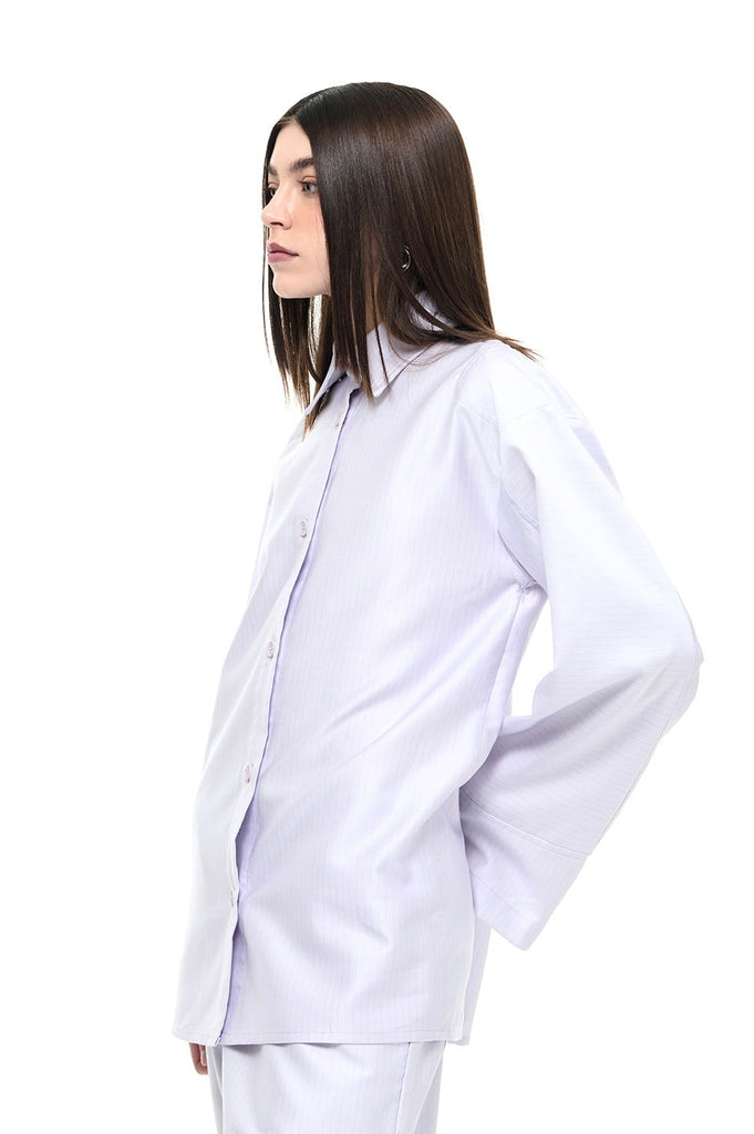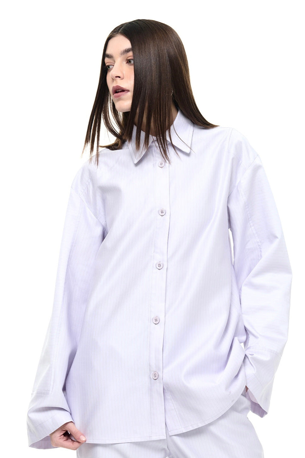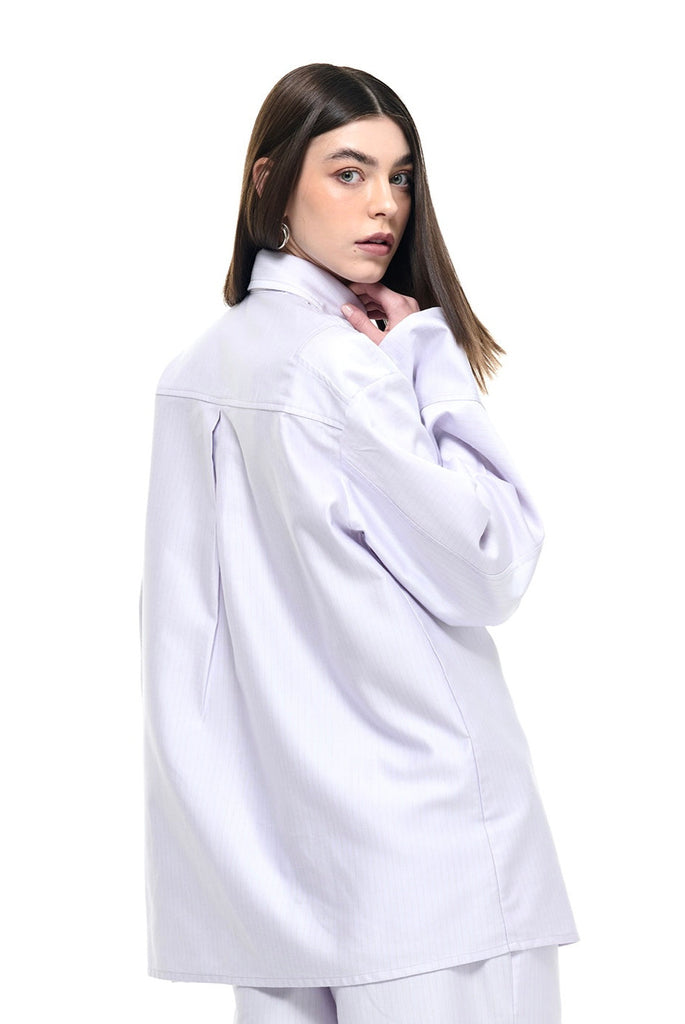 CAMISA OVERSIZED LISTRADA LILÁS, COM BOTÕES.
