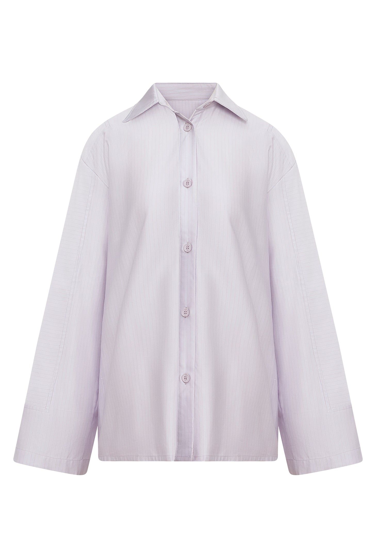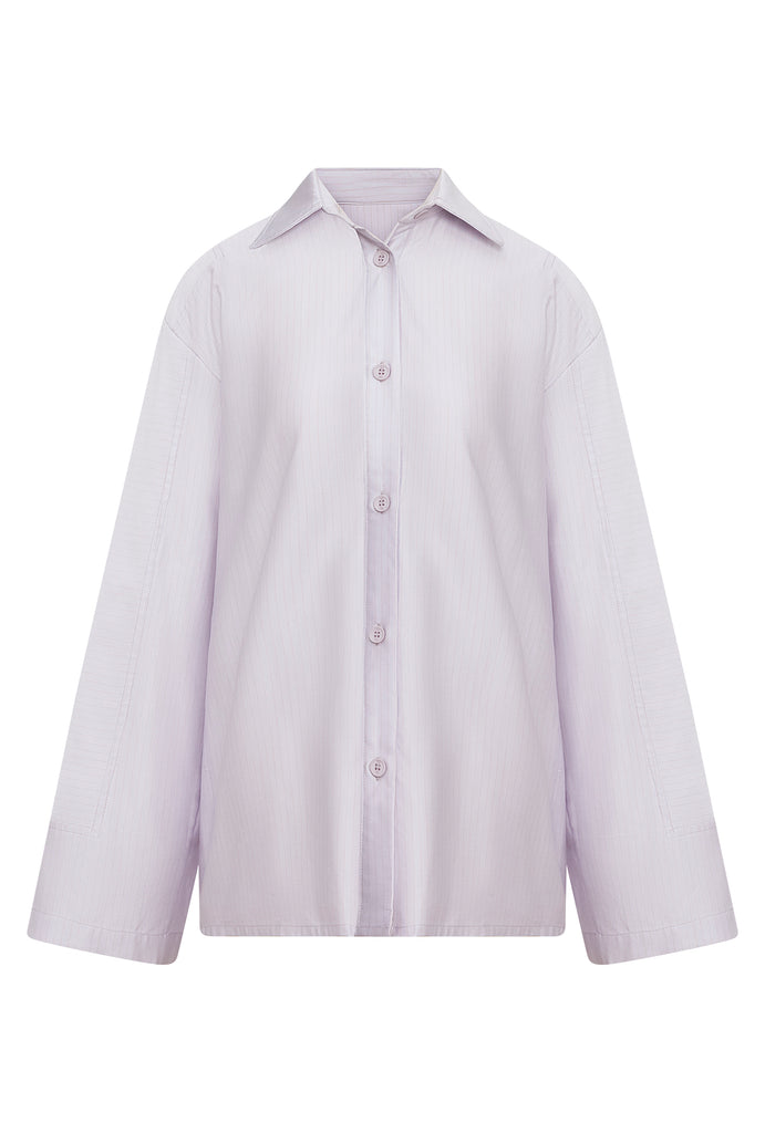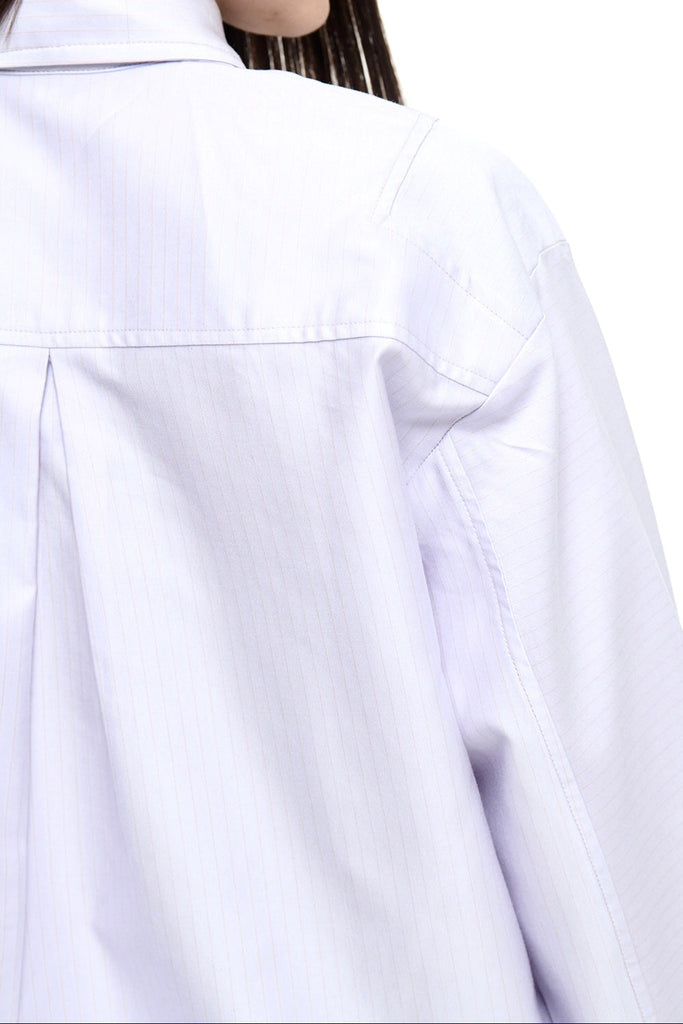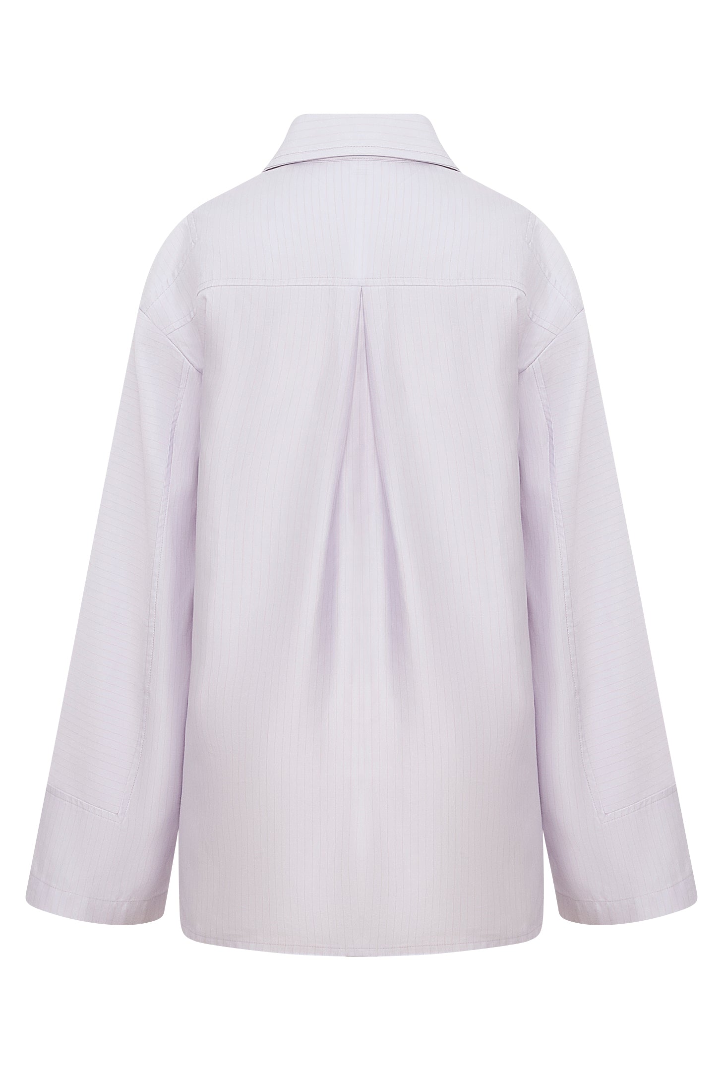 CAMISA OVERSIZED LISTRADA LILÁS, COM BOTÕES.