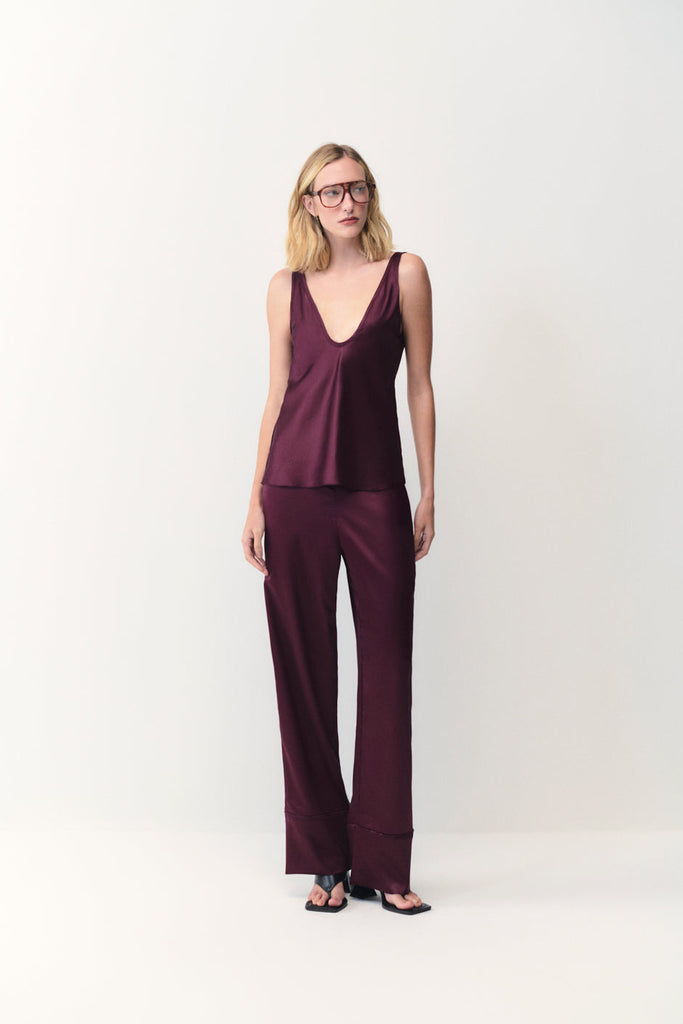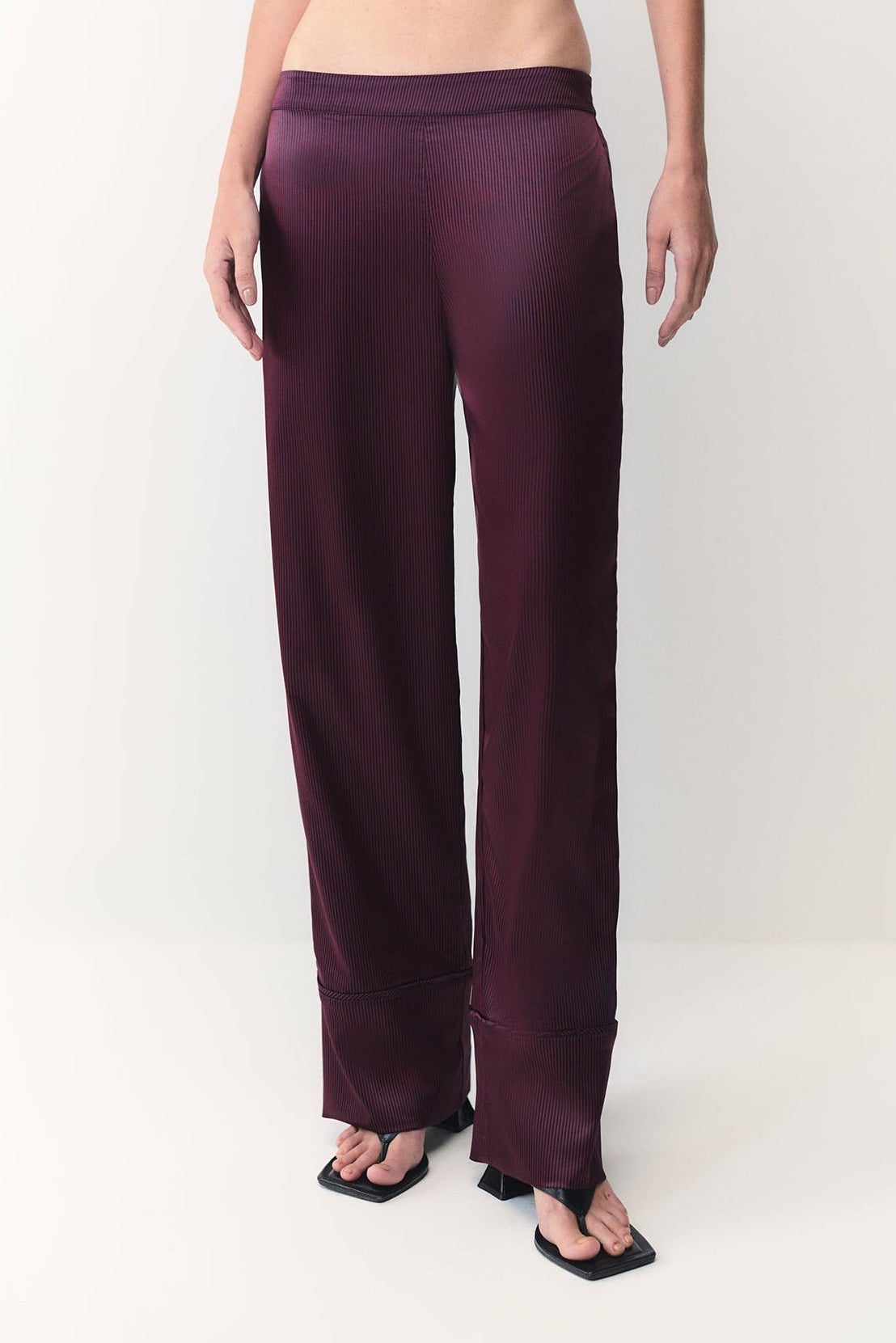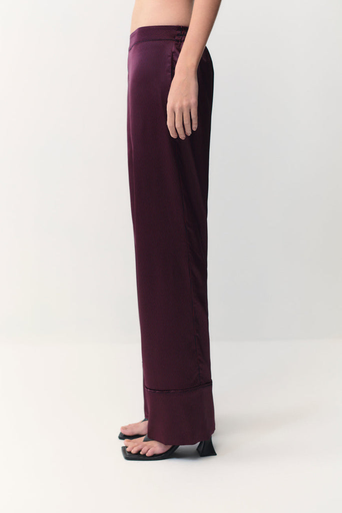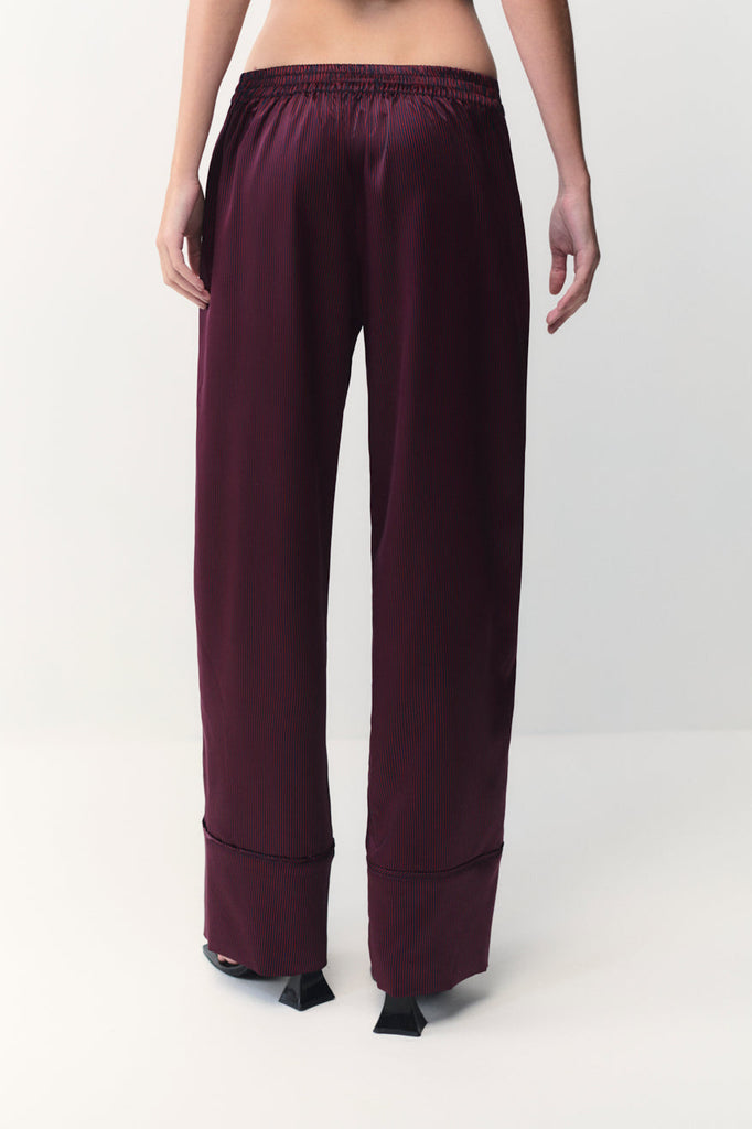 CALÇA EM CETIM AZUL-MARINHO COM LISTRA VERMELHA, CÓS ELÁSTICO E DETALHE NA BARRA