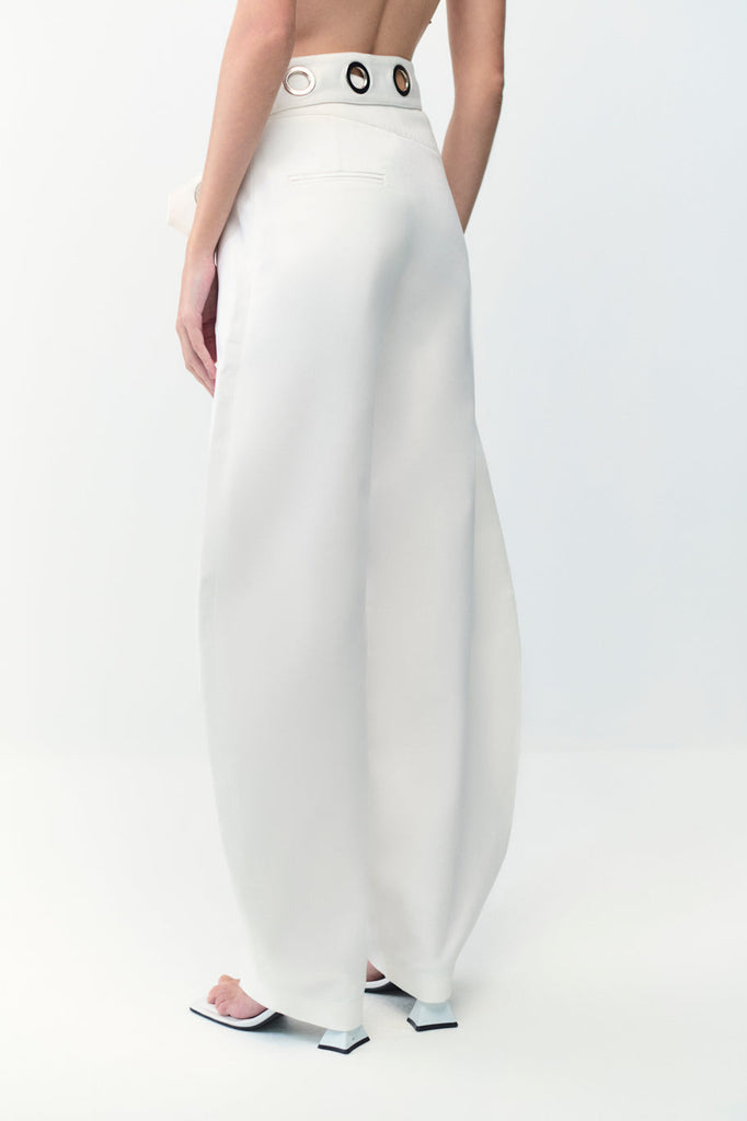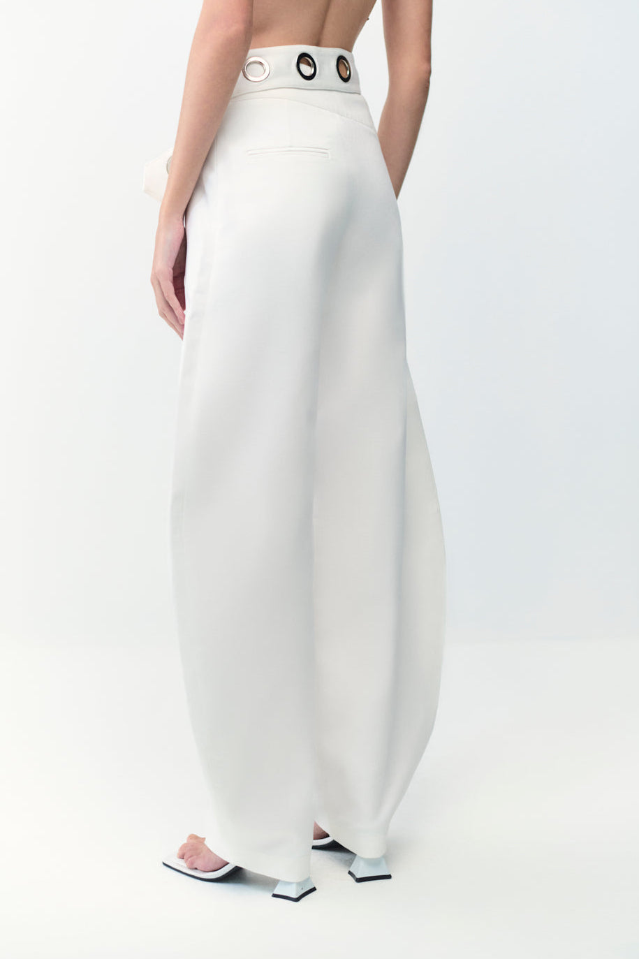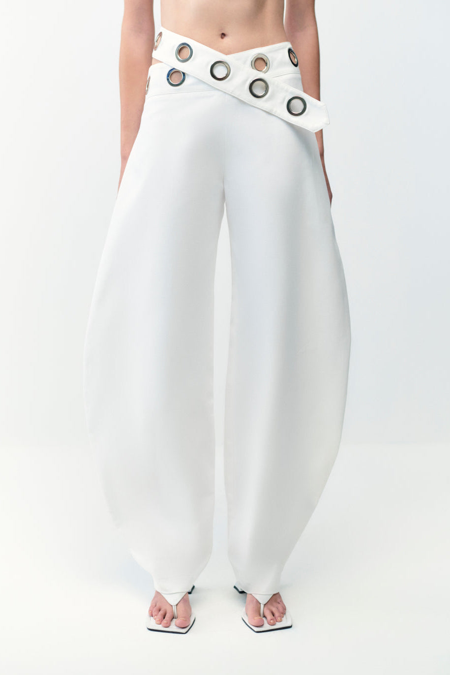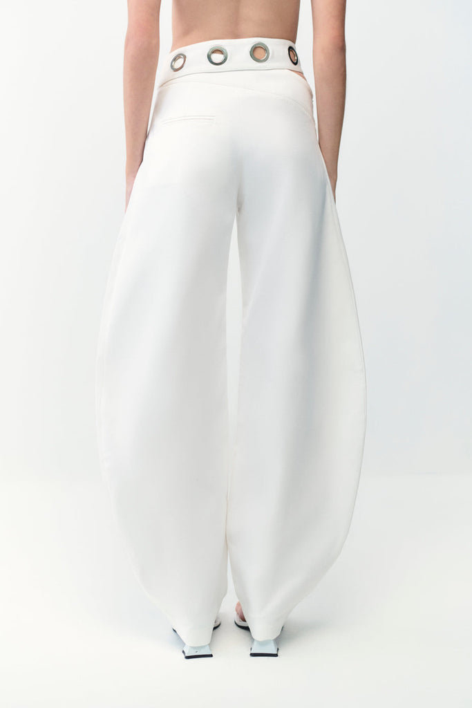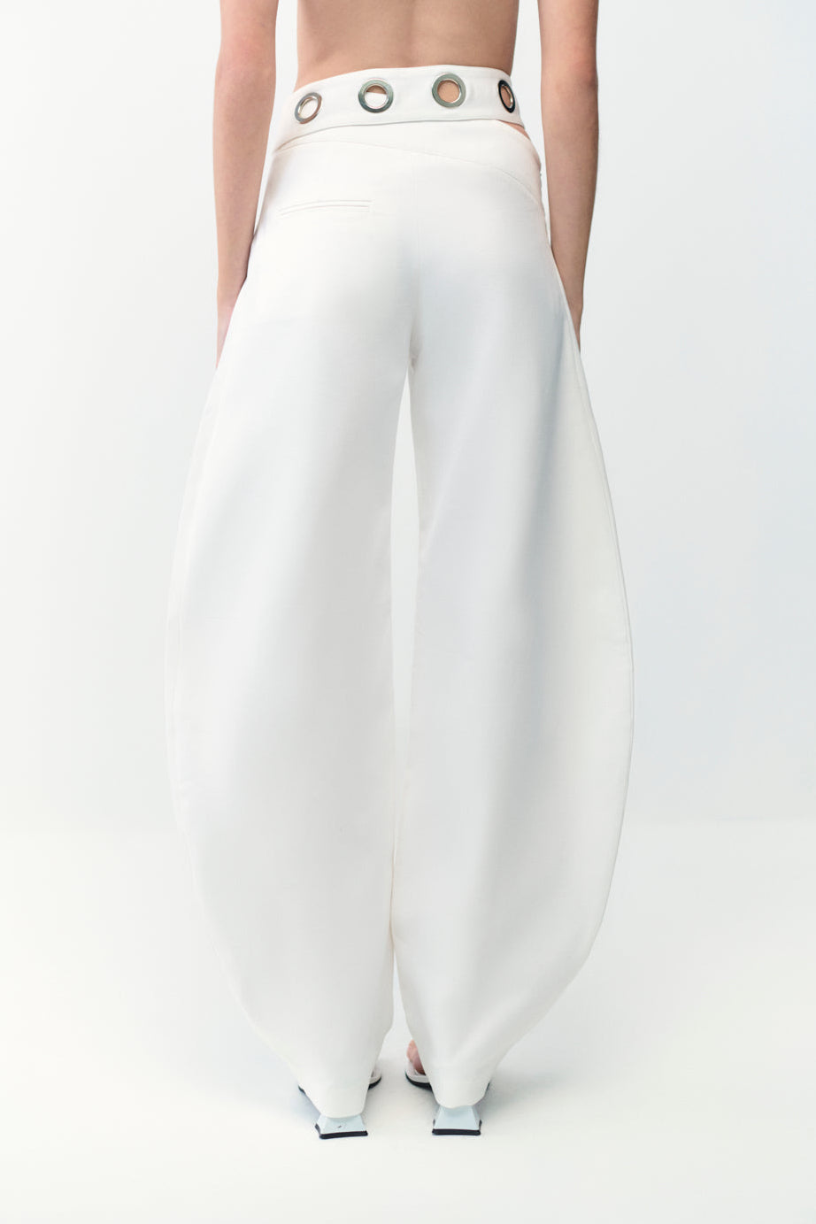 CALÇA DE ALFAIATARIA BALLOON BRANCA COM TRANSPASSE EM FORMATO DE GRAVATA E APLICAÇÃO DE ILHÓS