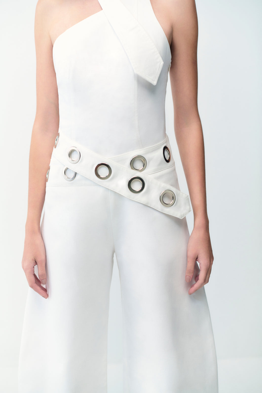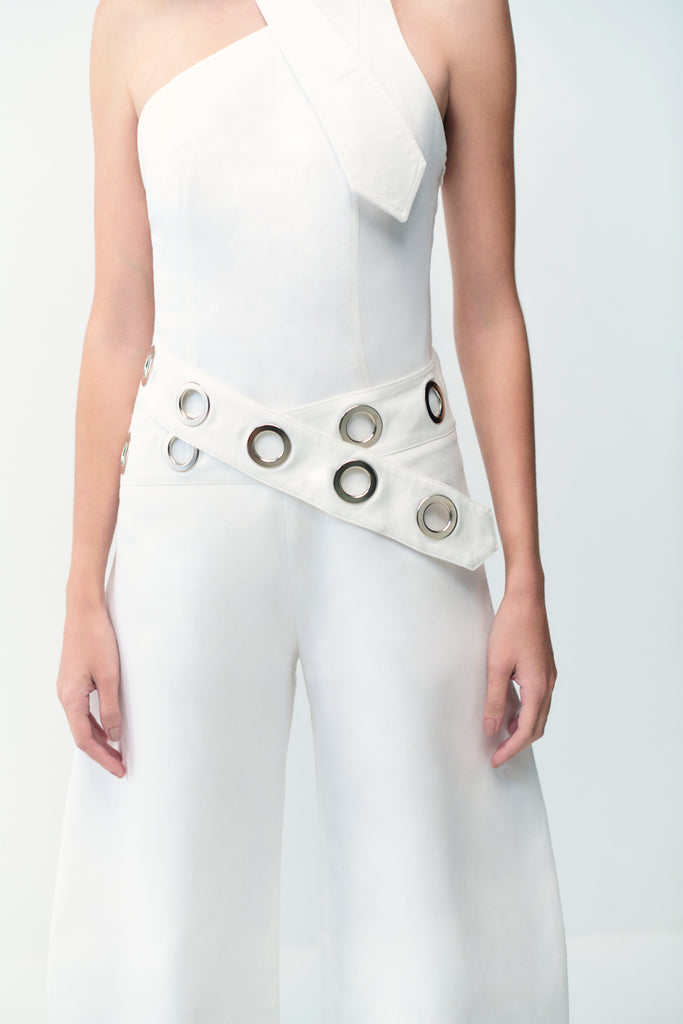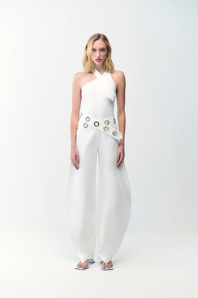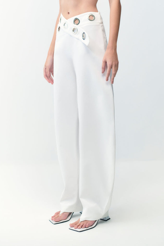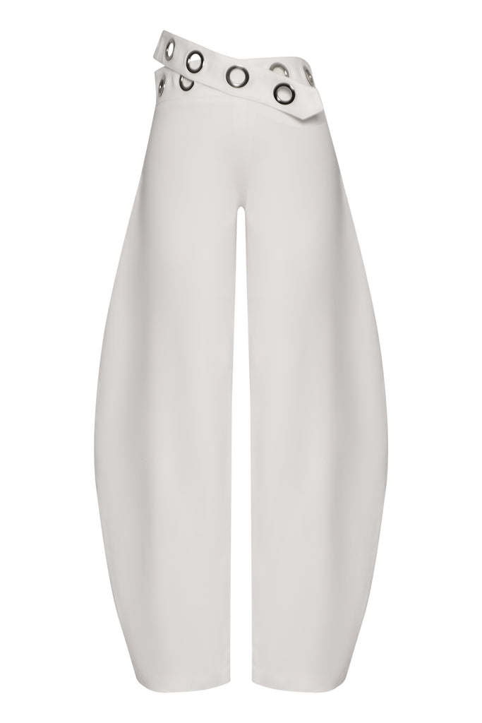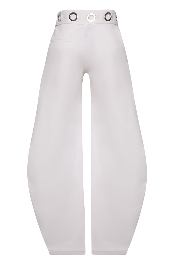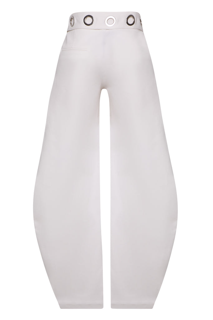 CALÇA DE ALFAIATARIA BALLOON BRANCA COM TRANSPASSE EM FORMATO DE GRAVATA E APLICAÇÃO DE ILHÓS