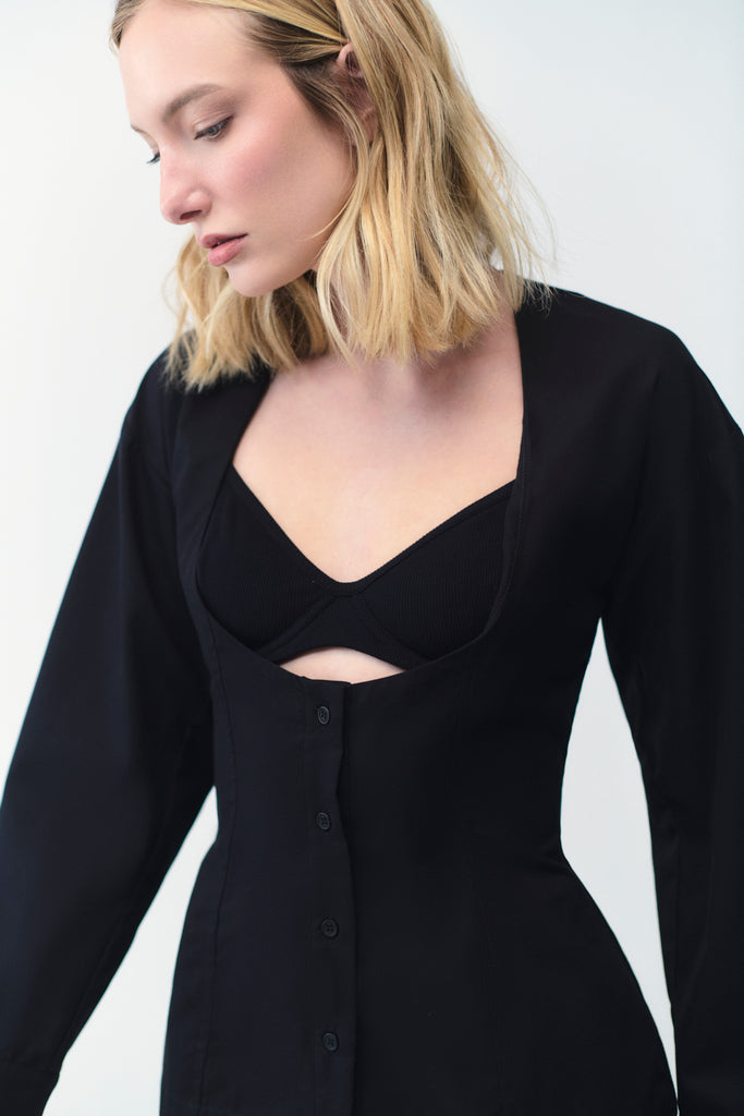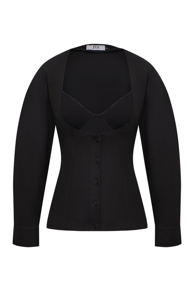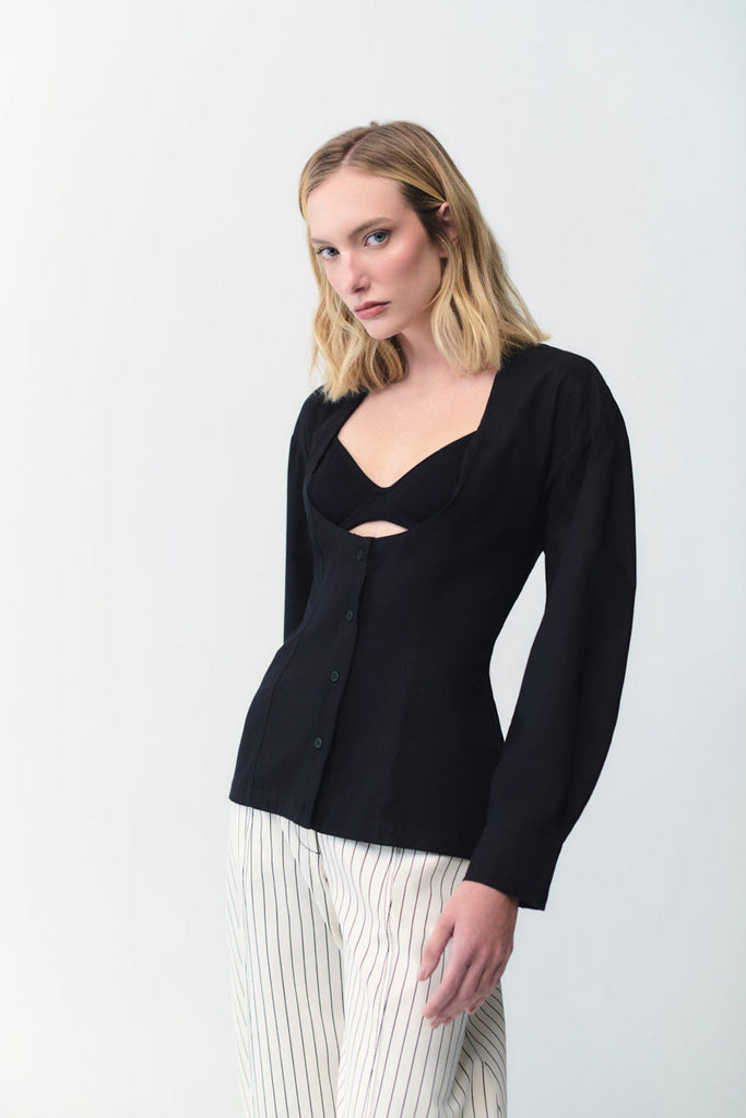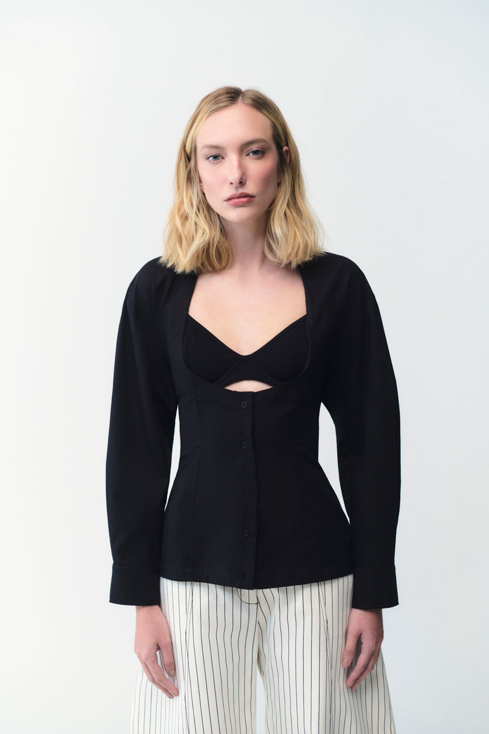 CAMISA PRETA COM MANGAS AMPLAS, ABERTURA NO BUSTO E SUTIÃ INCLUSO
