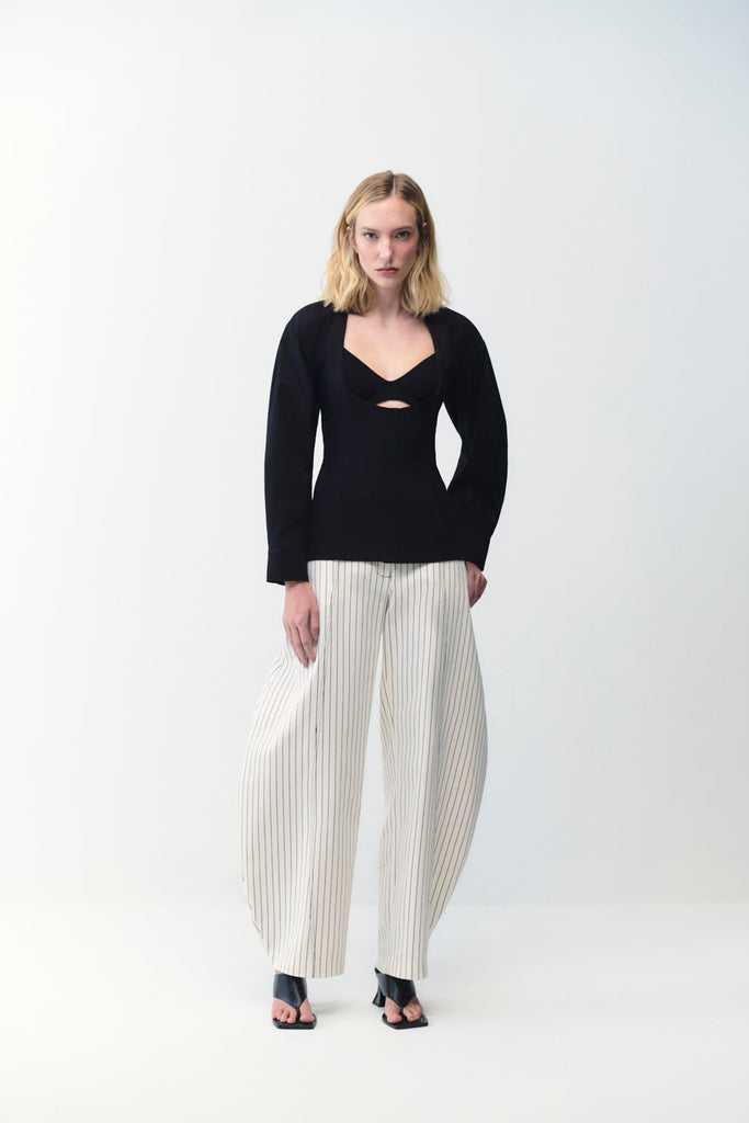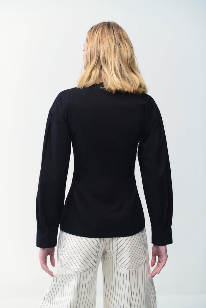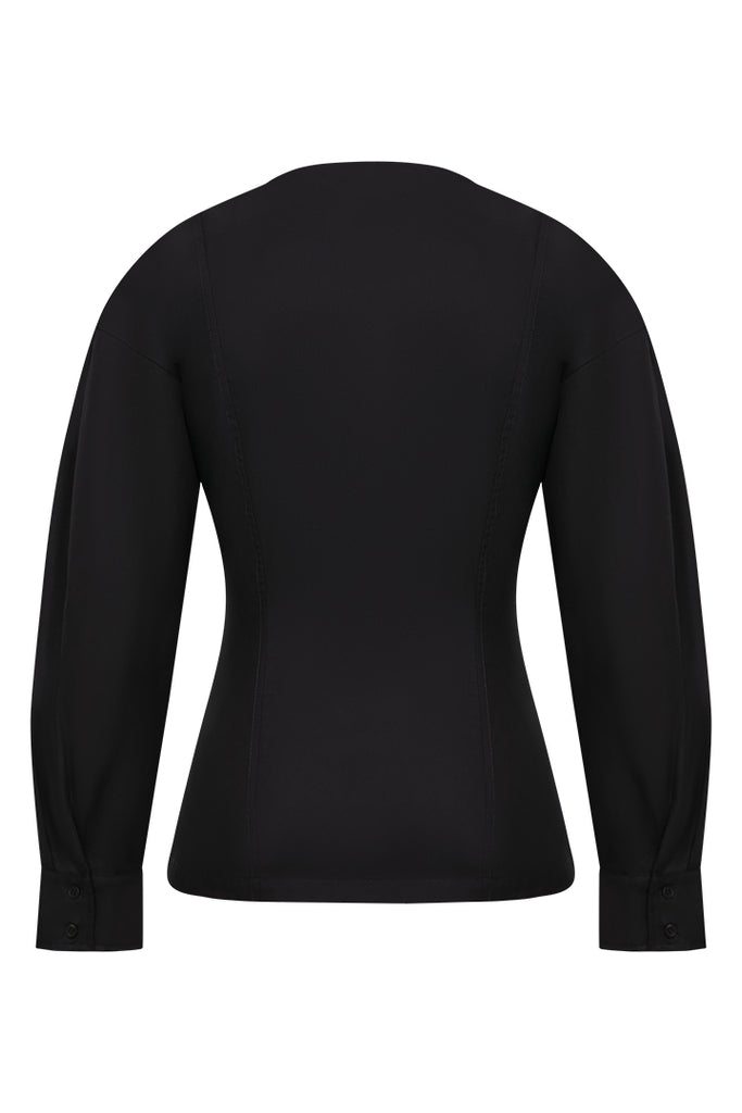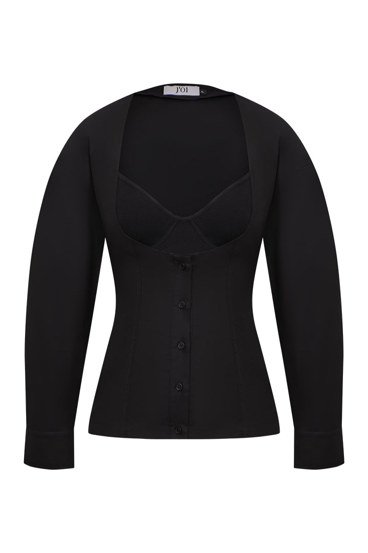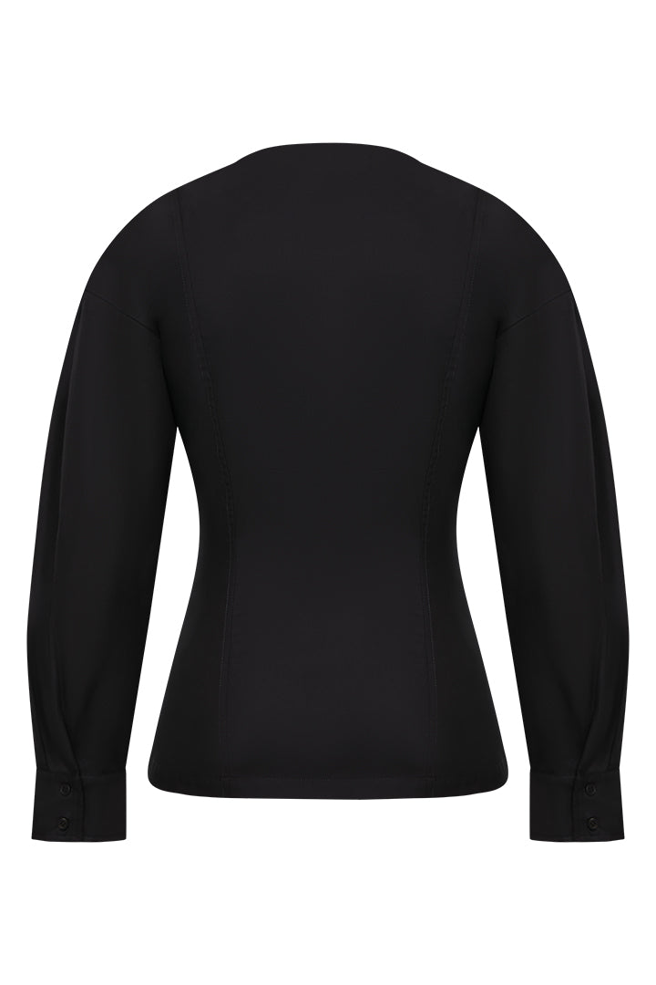 CAMISA PRETA COM MANGAS AMPLAS, ABERTURA NO BUSTO E SUTIÃ INCLUSO