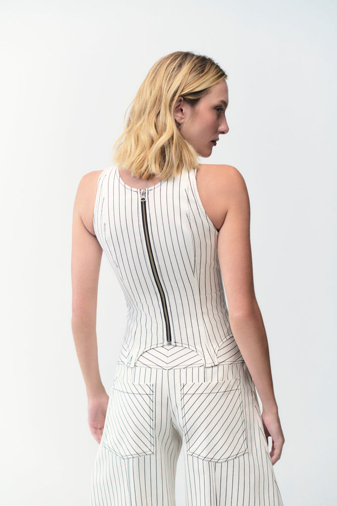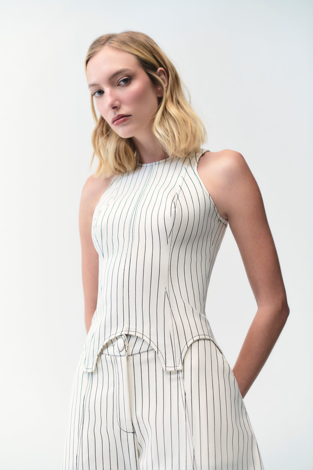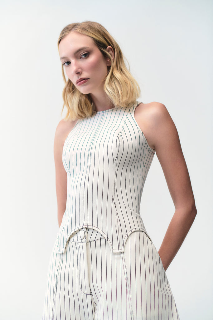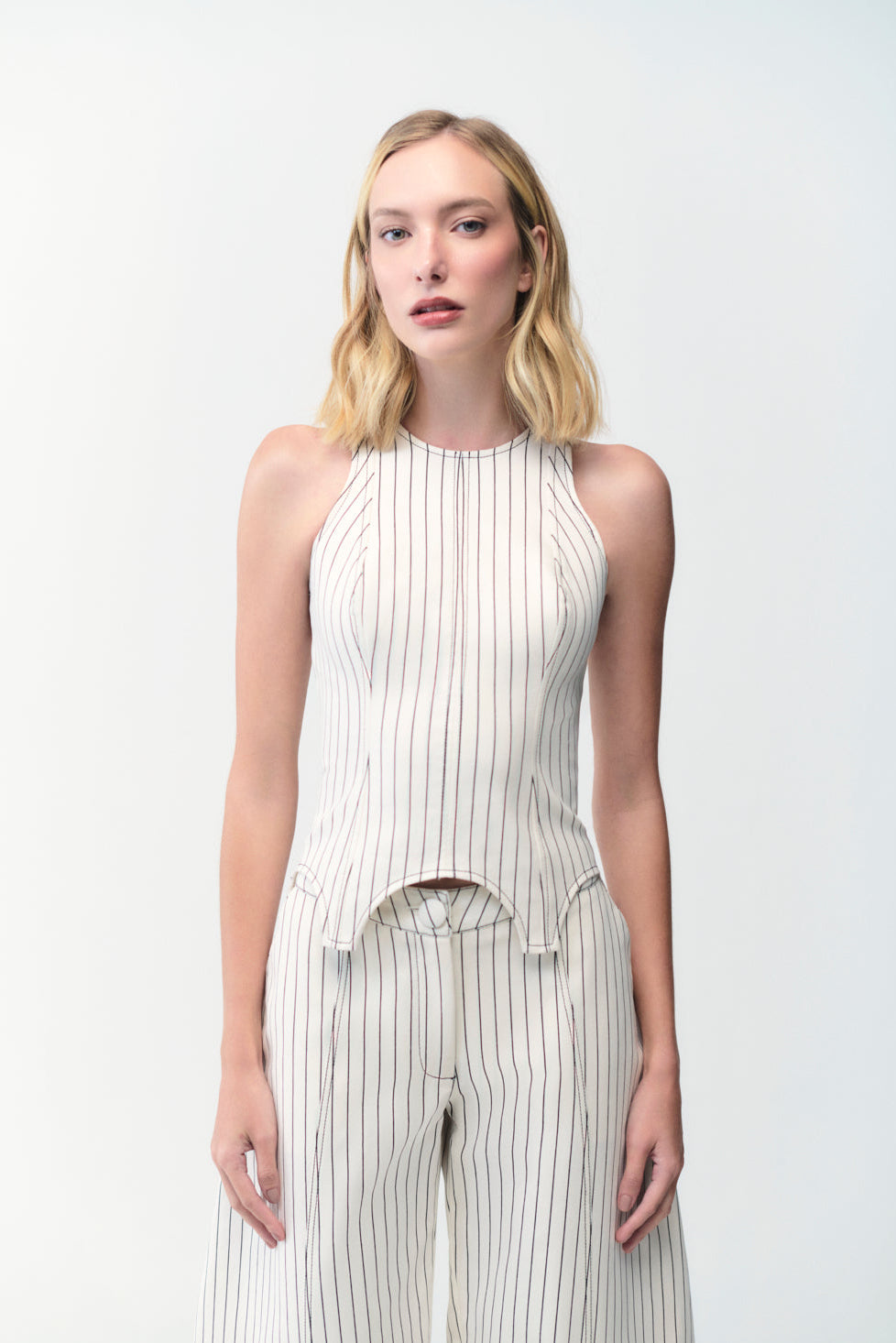 TOP DE ALFAIATARIA BRANCO LISTRADO COM RECORTES E PESPONTO