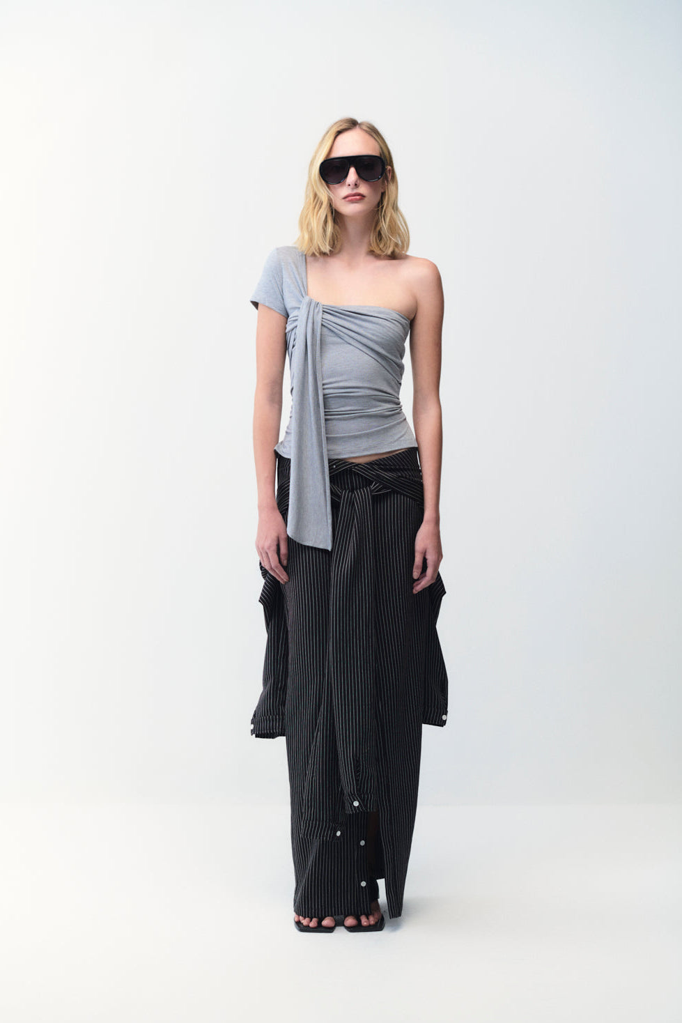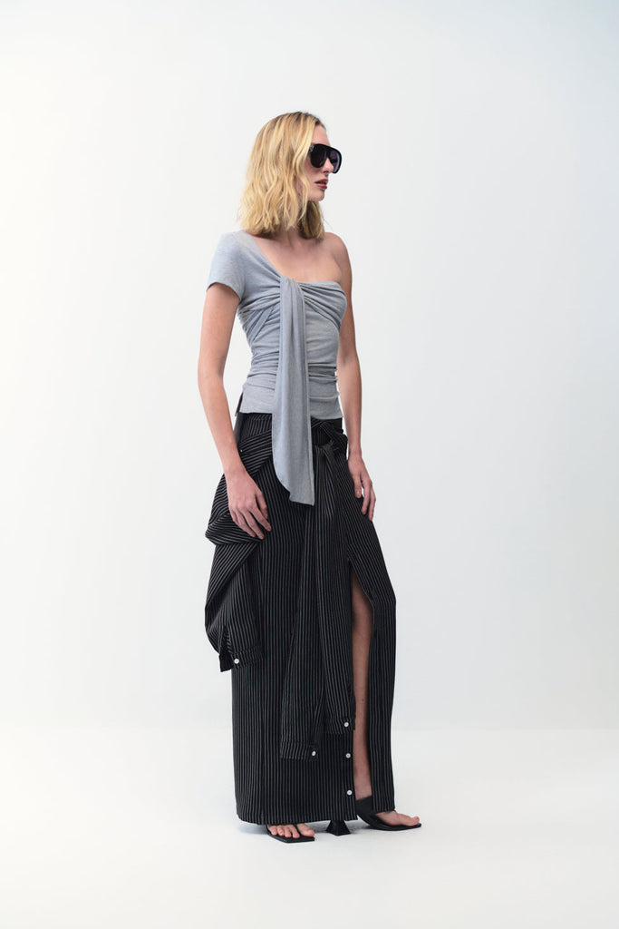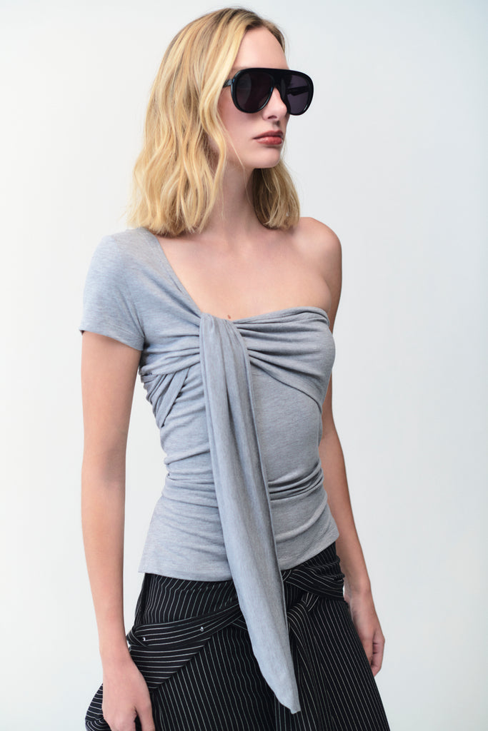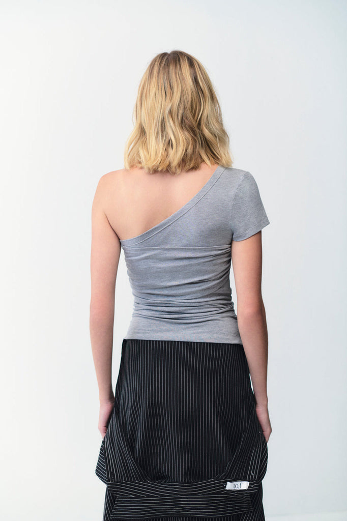BLUSA CINZA DUPLA DE UM OMBRO SÓ COM FAIXA ACOPLADA PASSANDO PELAS COSTAS E CRUZANDO NA FRENTE