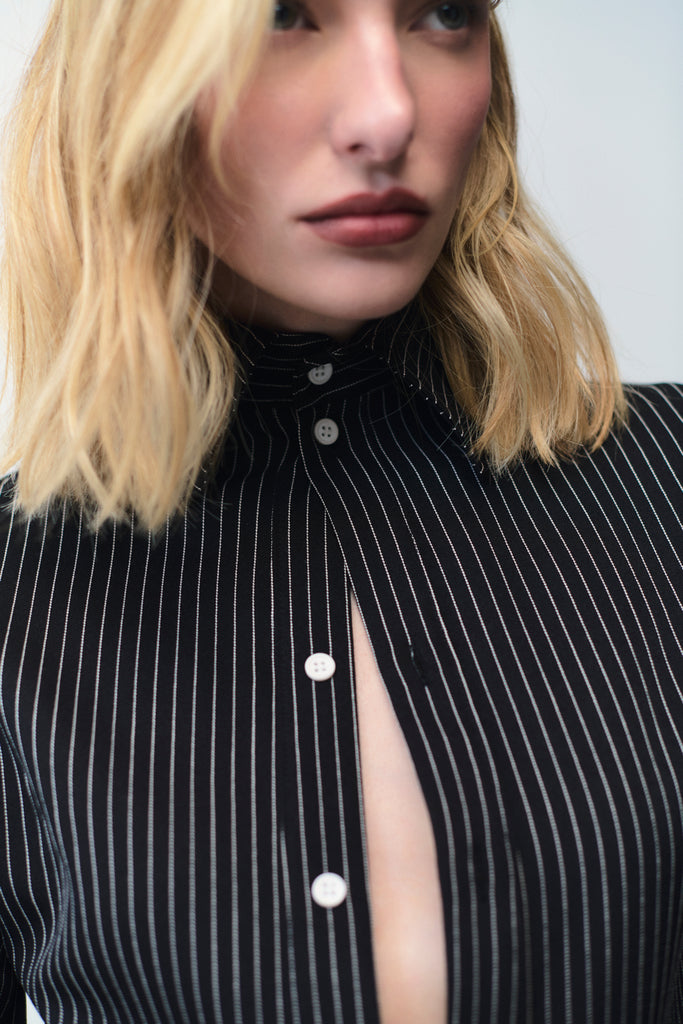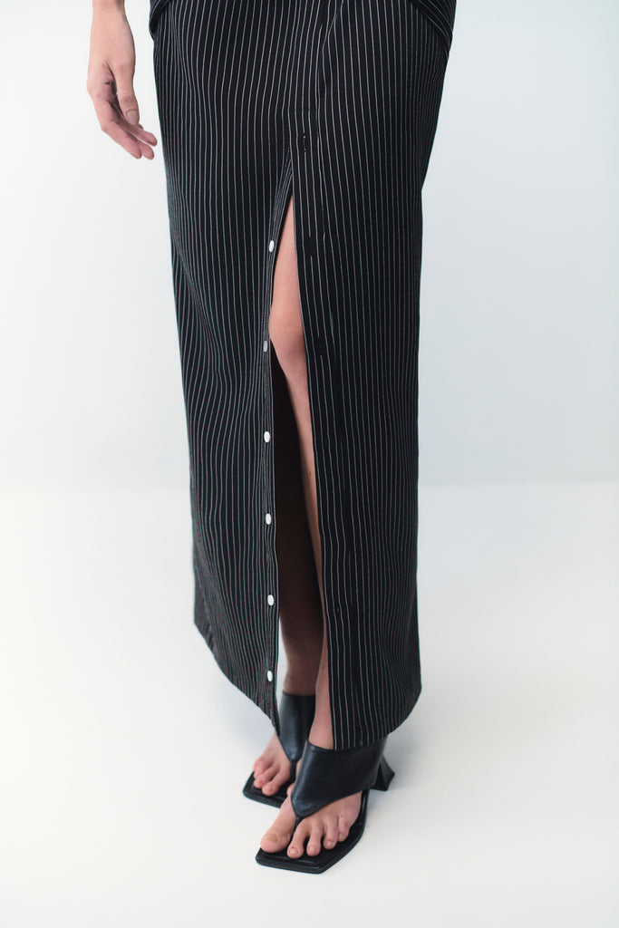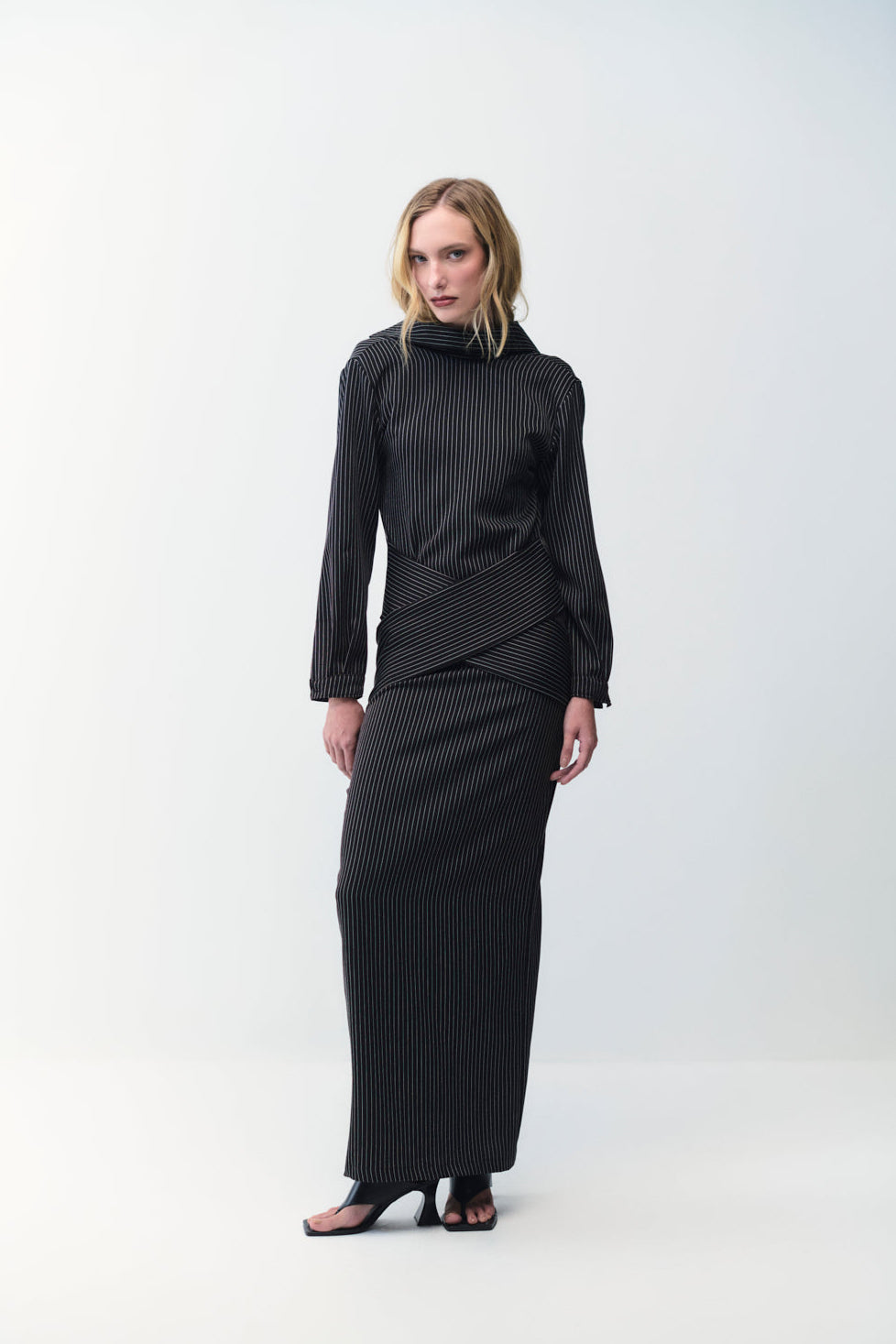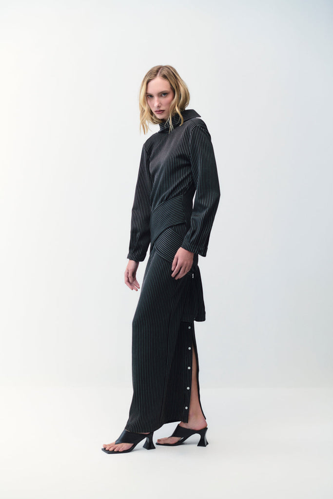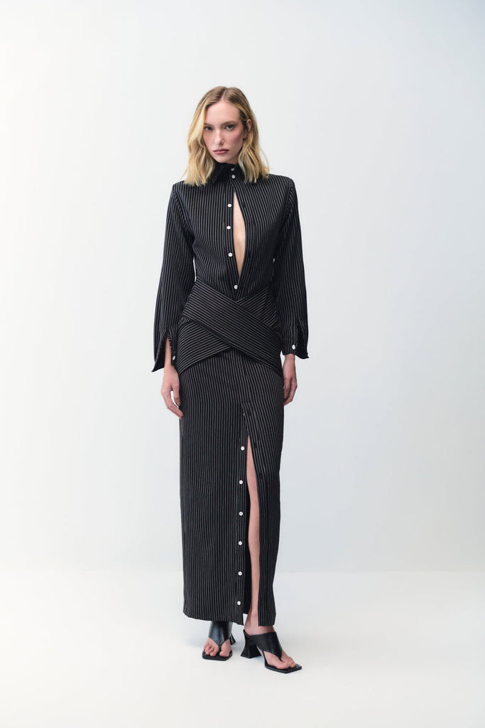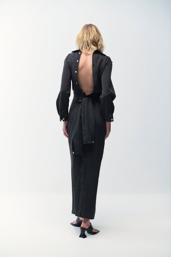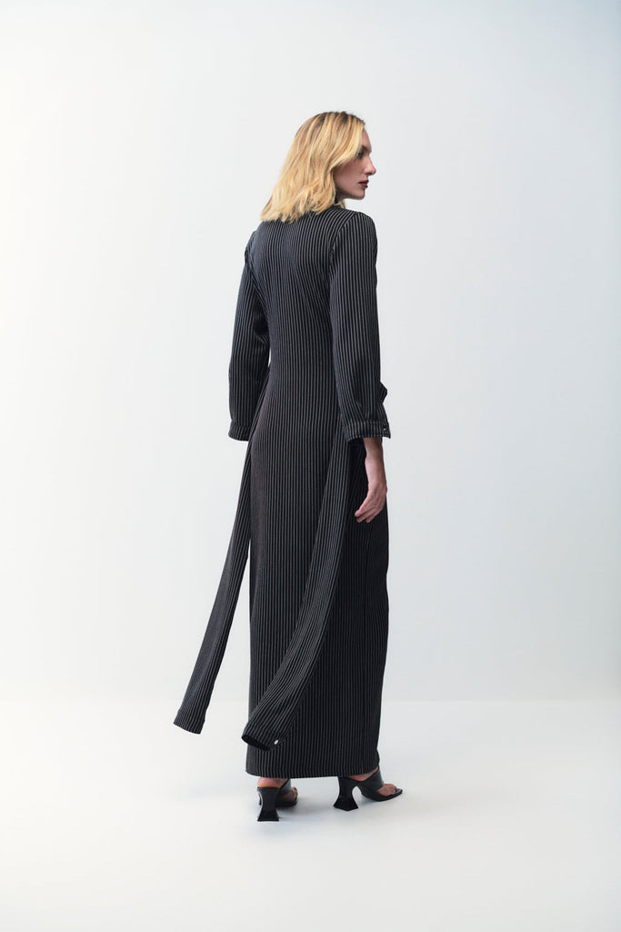 VESTIDO LONGO PRETO COM LISTRADO COM ABOTOAMENTO NAS COSTAS E MANGAS LATERAIS PARA AMARRAÇÃO