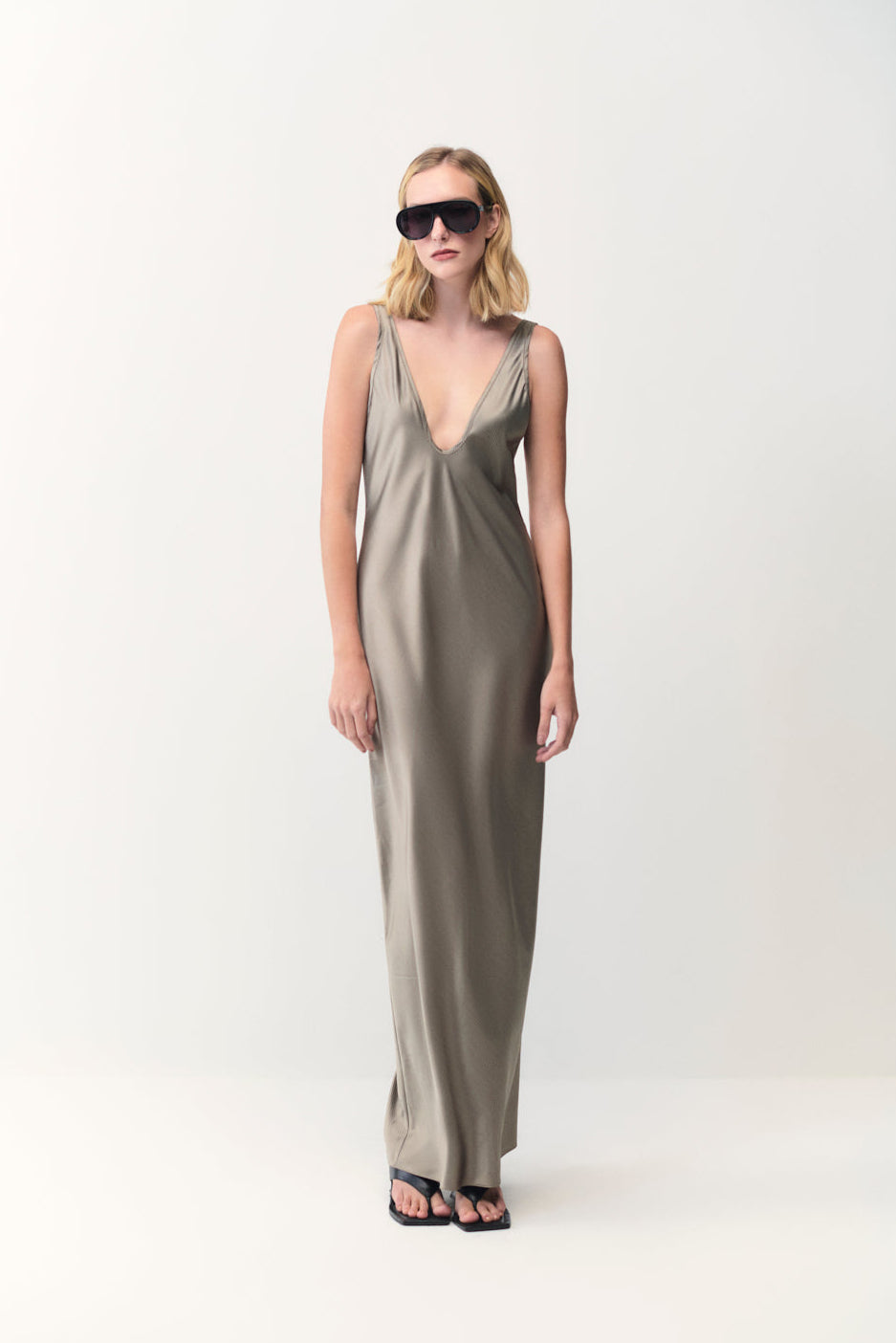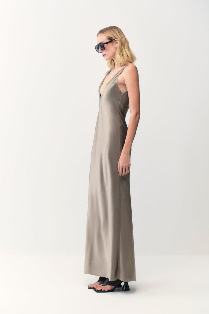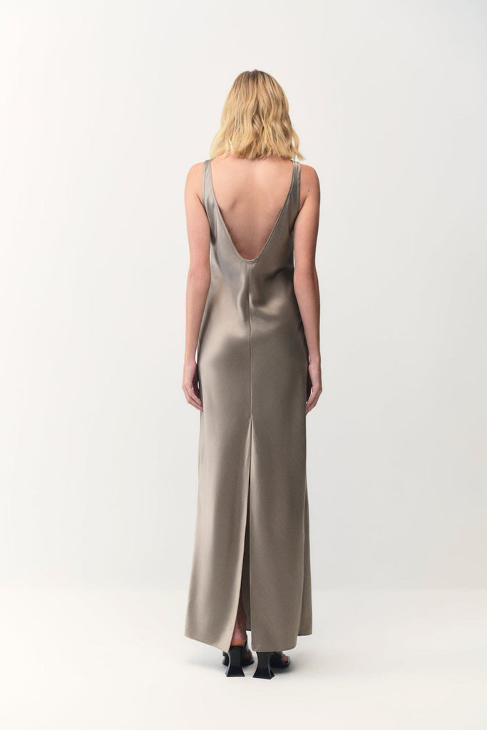 VESTIDO REGATA EM CETIM CINZA COM LISTRA PRETA CORTADO EM VIÉS
