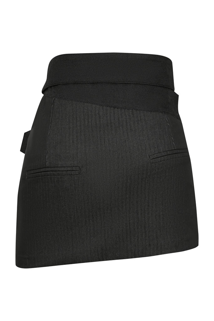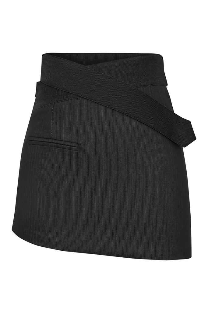 MINI SAIA DE ALFAIATARIA CINZA ESCURO LISTRADO COM TRANSPASSE EM FORMATO DE GRAVATA