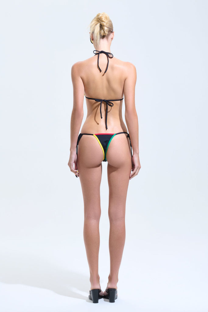 CALCINHA DE BIQUÍNI MODELO LACINHO, PRETA, COM VIÉS NAS CORES DA JAMAICA.