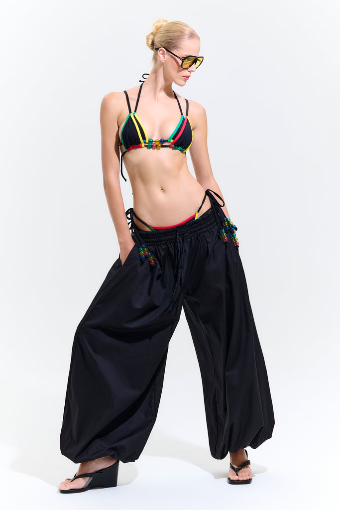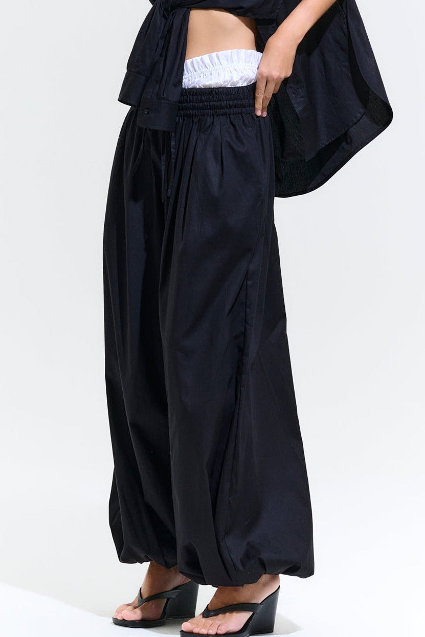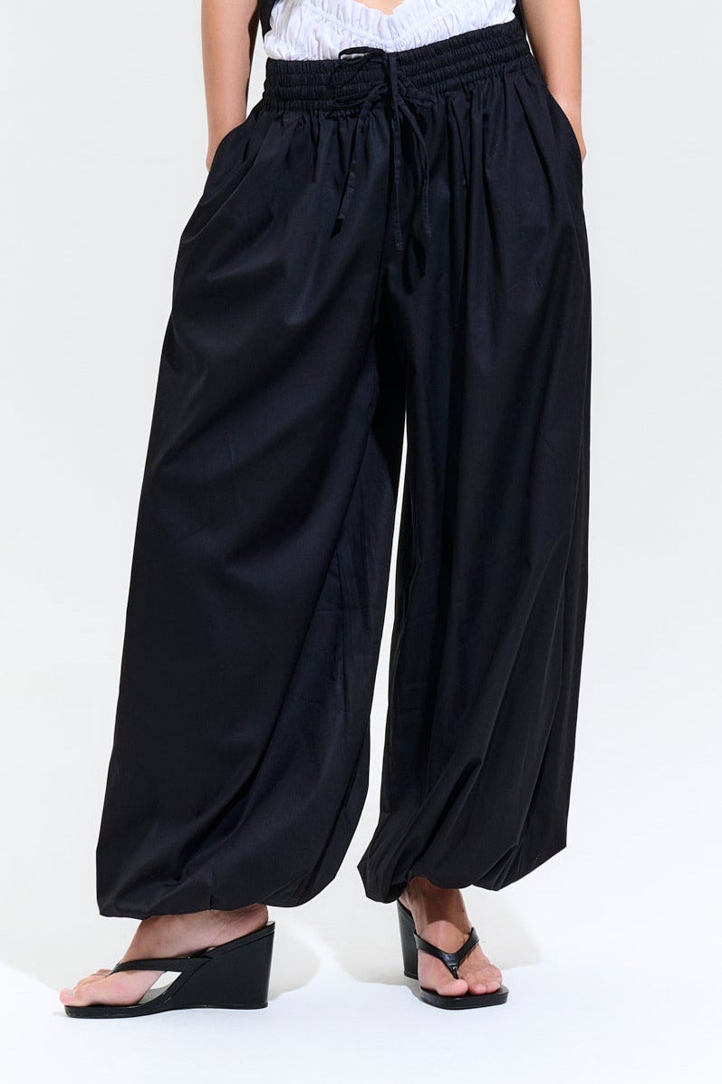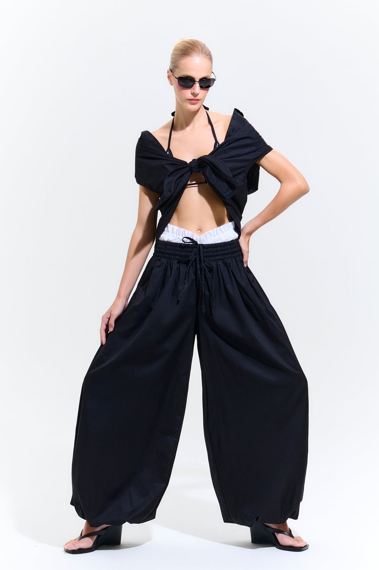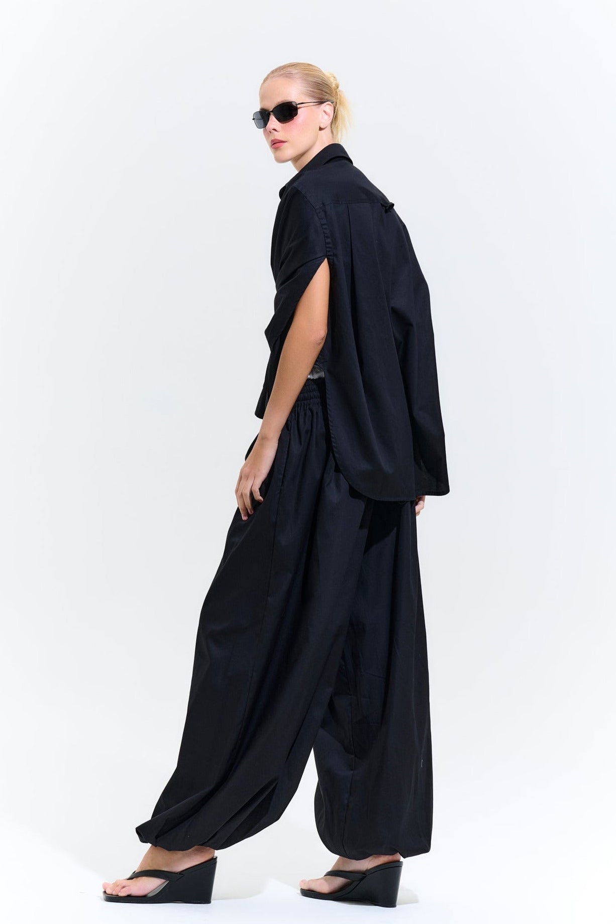 CALÇA ALADIM EM TECIDO PRETO E CÓS DUPLO.