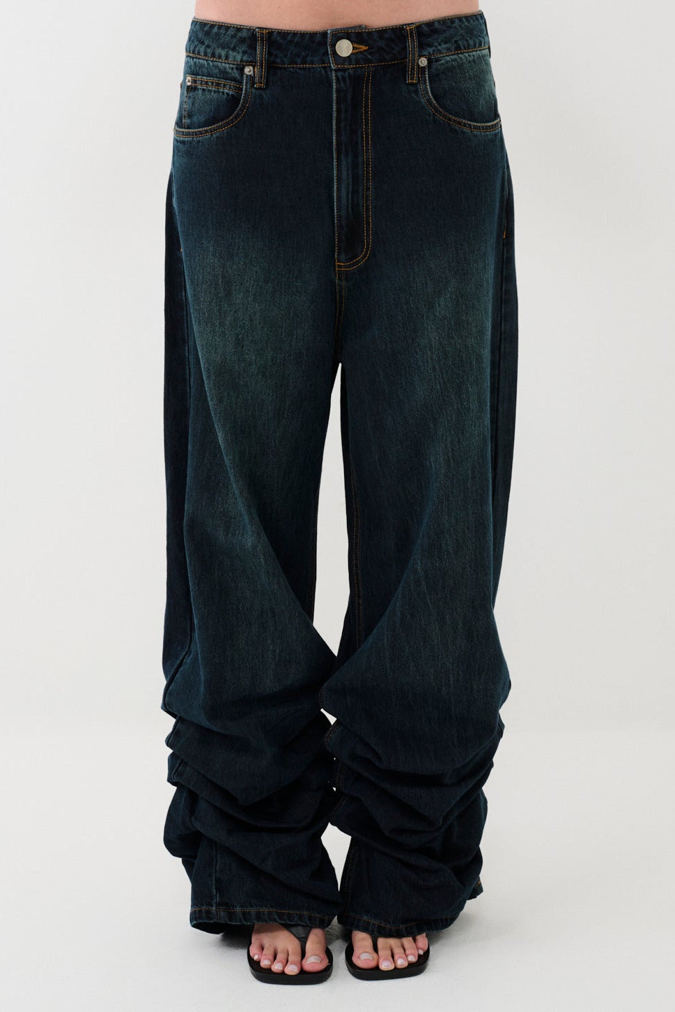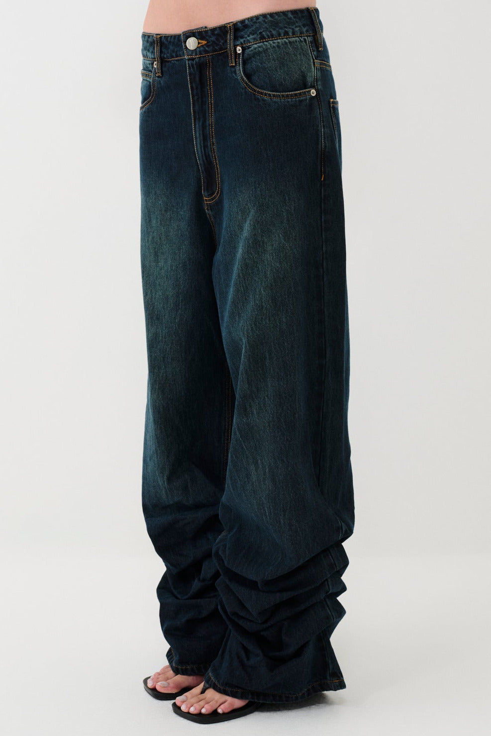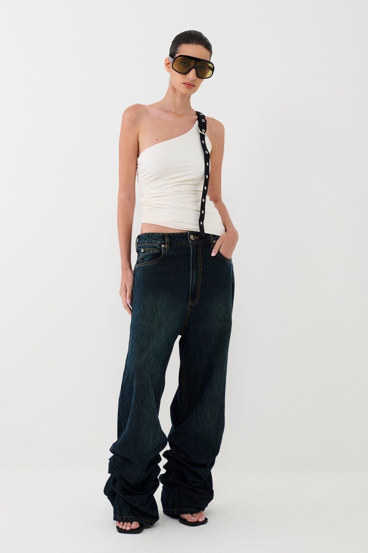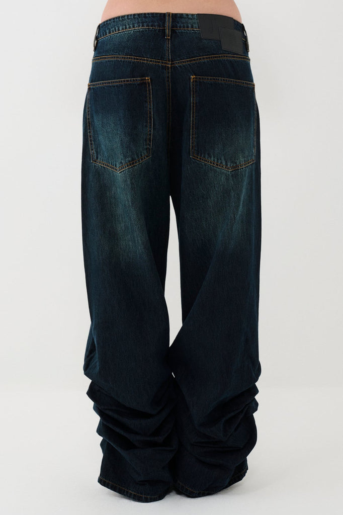 CALÇA JEANS AZUL DE CINTURA BAIXA, COM BARRA FRANZIDA E AJUSTÁVEL.