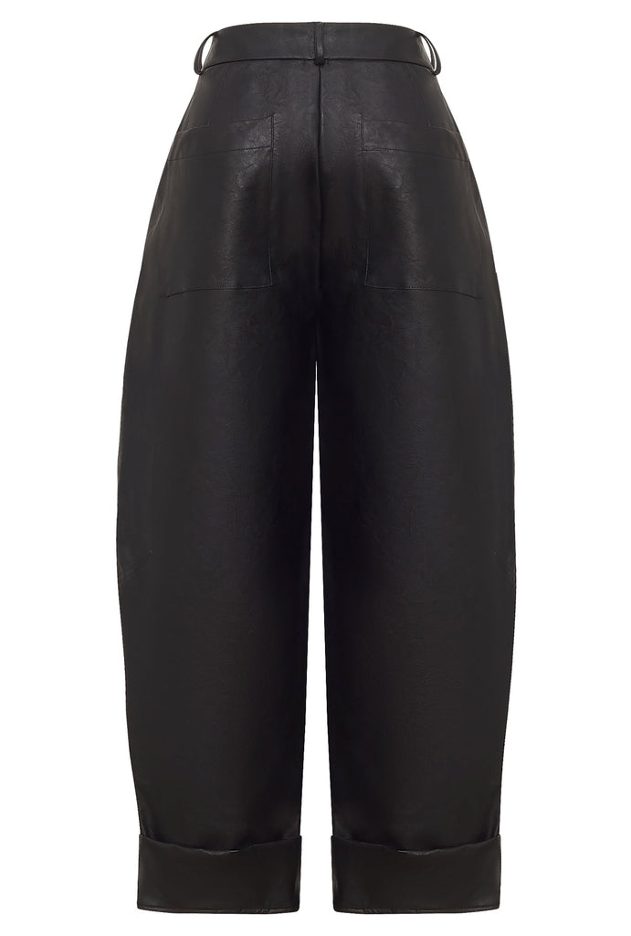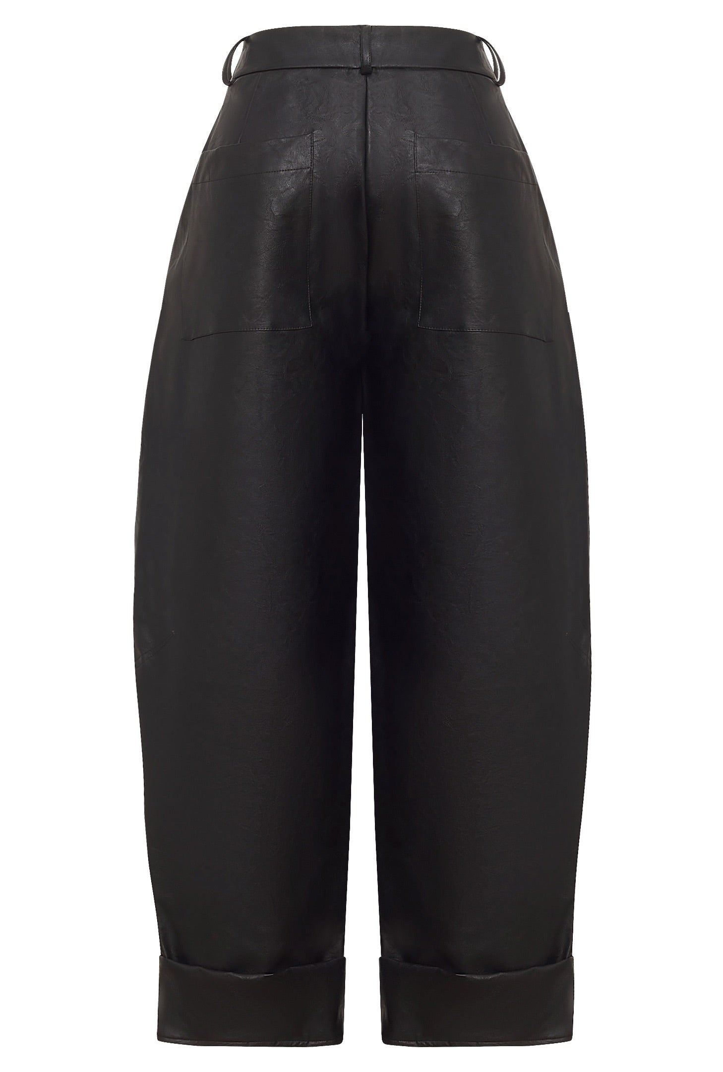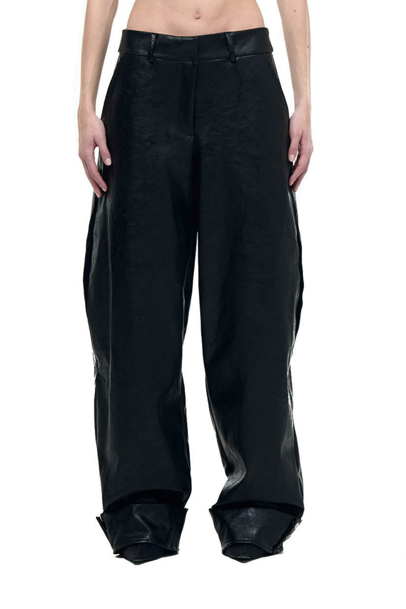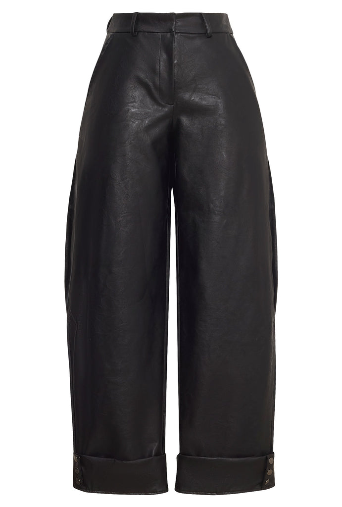 CALÇA OVERSIZED COM BARRA DOBRADA COM BOTÕES, EM COURO SINTÉTICO PRETO.