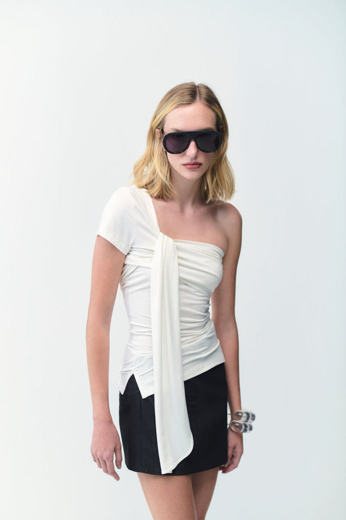 BLUSA OFF WHITE DUPLA DE UM OMBRO SÓ COM FAIXA ACOPLADA PASSANDO PELAS COSTAS E CRUZANDO NA FRENTE